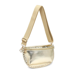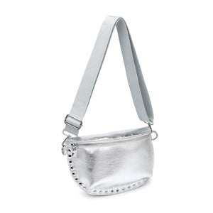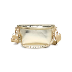 Gizelle metallic belt bag — sculpted, studded half-moon with statement sheen.