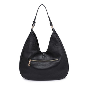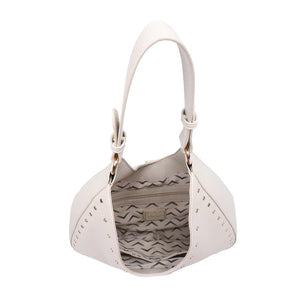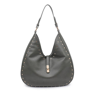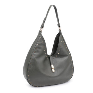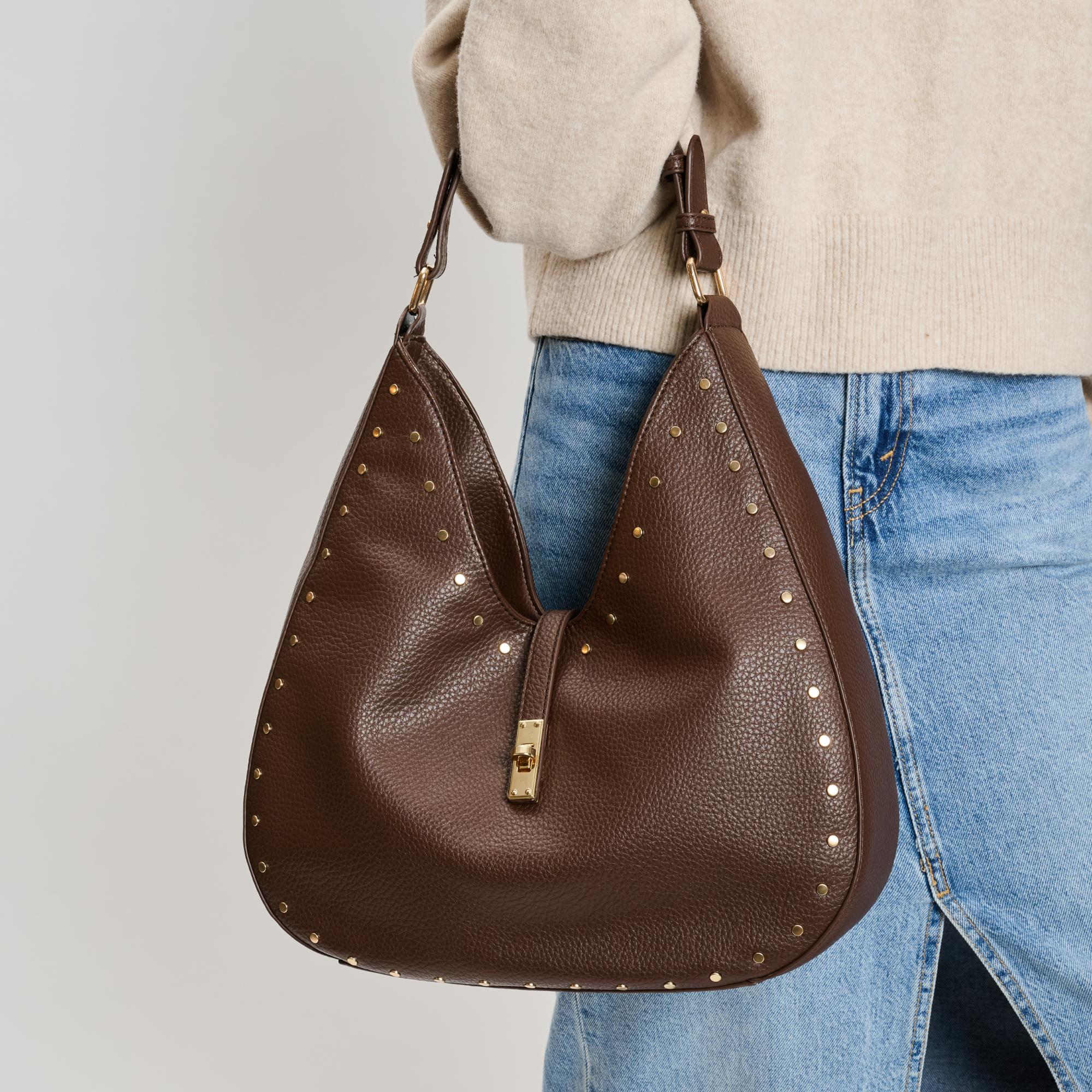 Introducing a hobo bag that effortlessly blends edge with elegance, crafted from pebbled vegan leather. The exterior boasts stud embellishments and gold hardware, while the turn lock loop closure adds a touch of sophistication. Inside, a printed fabric lining, one zip pocket, and two slip pockets ensure your essentials are stylishly organized.