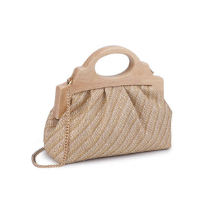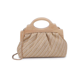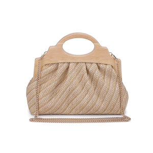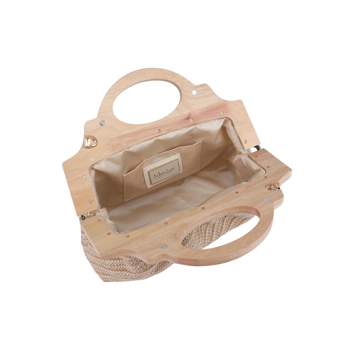 • Exterior Details: Woven Design, Wooden Handle, Gold Foil Accents, Gold Hardware, Detachable Chain Strap