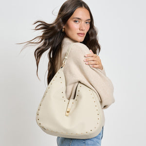 Introducing a hobo bag that effortlessly blends edge with elegance, crafted from pebbled vegan leather. The exterior boasts stud embellishments and gold hardware, while the turn lock loop closure adds a touch of sophistication. Inside, a printed fabric lining, one zip pocket, and two slip pockets ensure your essentials are stylishly organized.