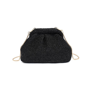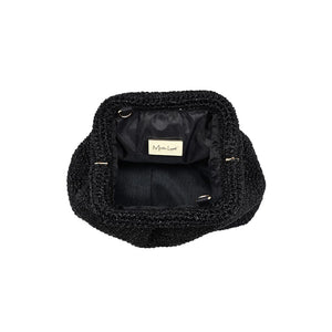 Exterior Details: Detachable gold-tone chain clips to frame rings for shoulder or crossbody wear; braided woven exterior adds texture and a stable flat base for upright standing.