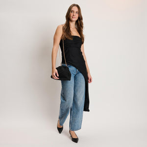 Interior Details: Fabric-lined interior with a single open compartment and attachment rings for the chain or accessories, fits phone, cards, keys, and lipstick.