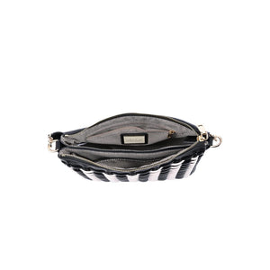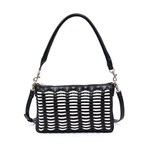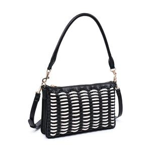 Exterior Details: Woven black-and-white front panel creates a structured profile; removable shoulder strap fastens with swivel clasps to metal rings and a smooth rear panel.