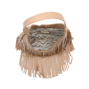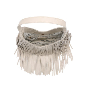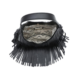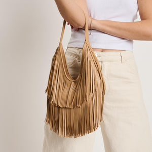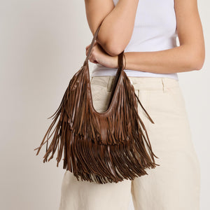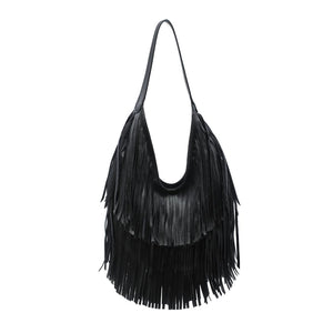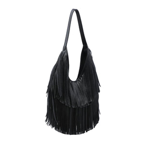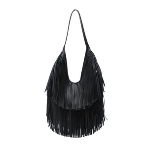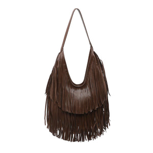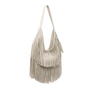 Exterior Details: single shoulder strap and layered fringe panels form a draped hobo silhouette with a wide mouth for easy over-the-shoulder carry and casual wear