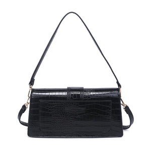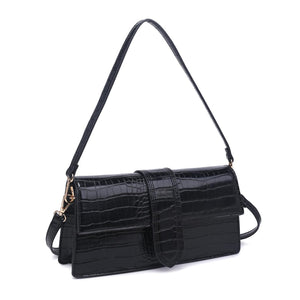 Exterior Details: Croc-embossed finish on a rectangular, structured body with a short shoulder strap plus a removable crossbody strap that clips on with gold-tone swivel hooks.