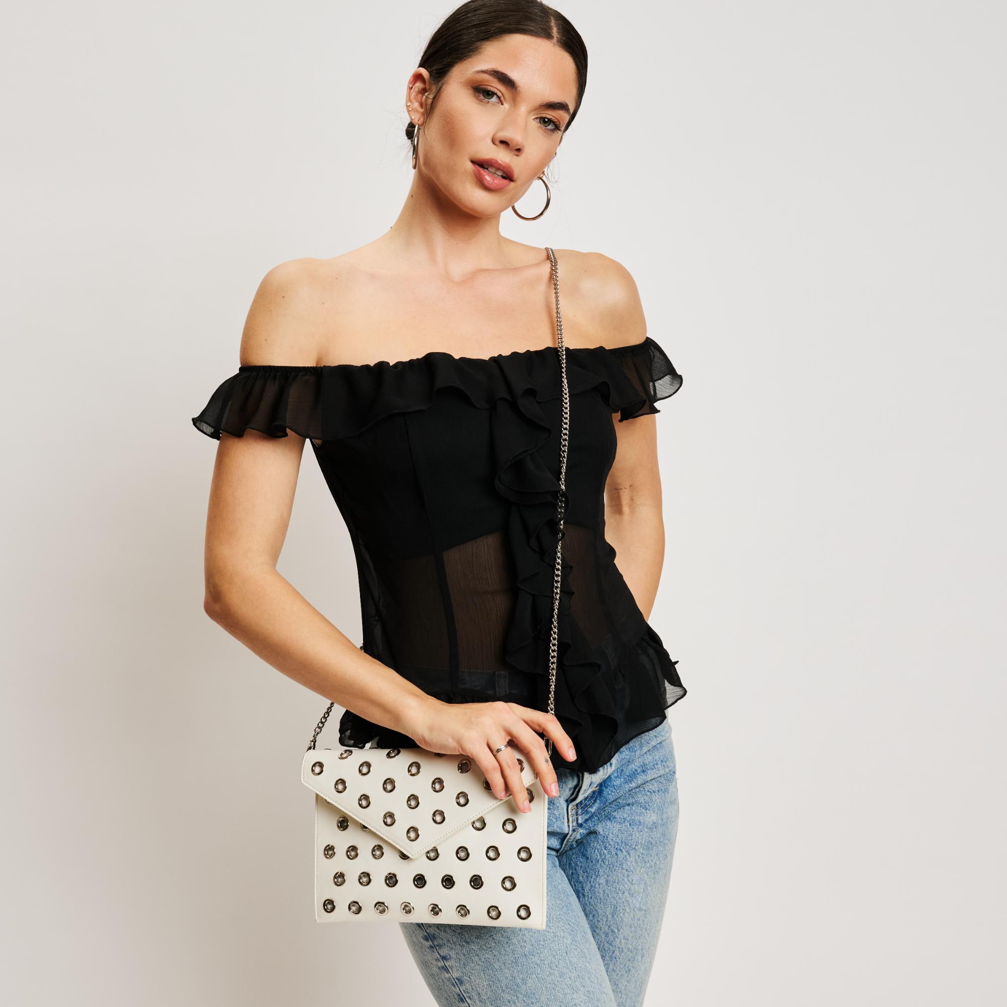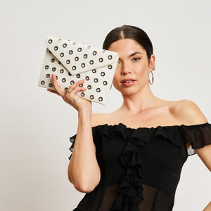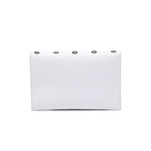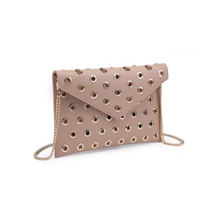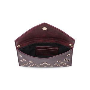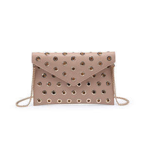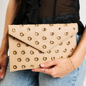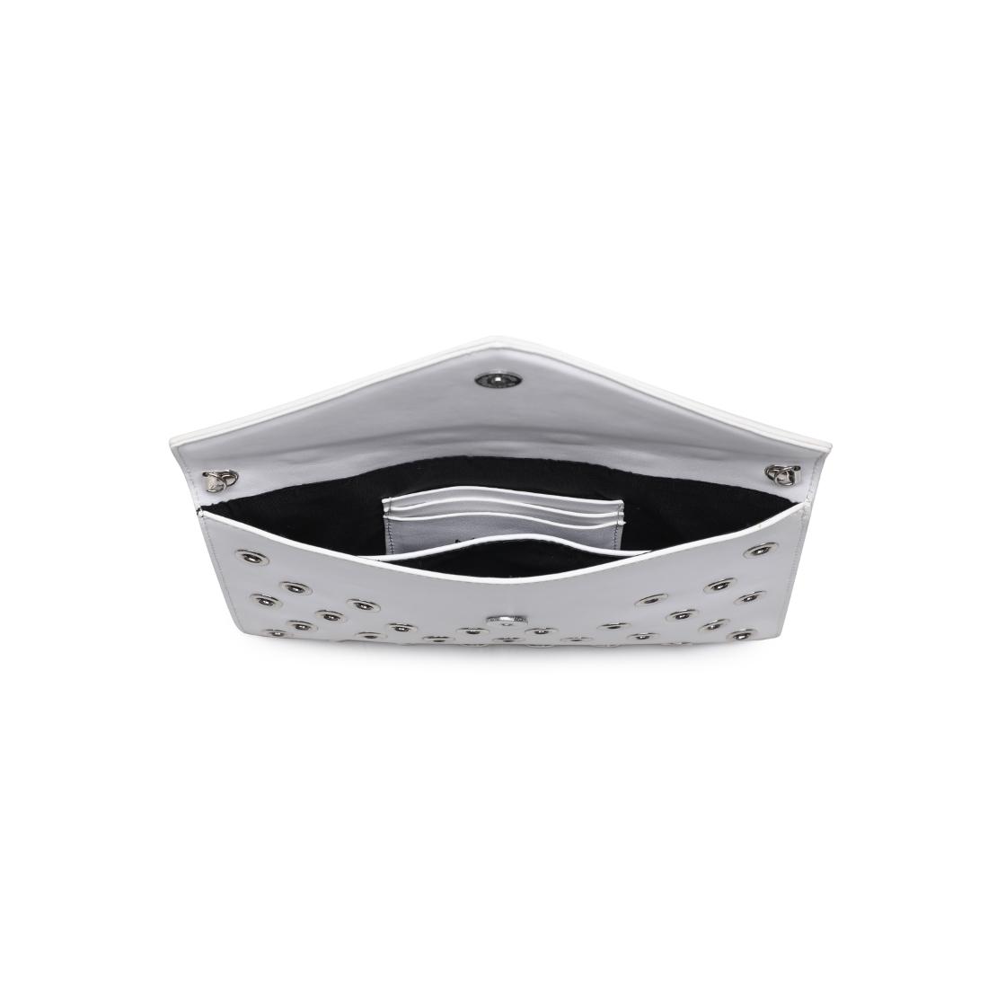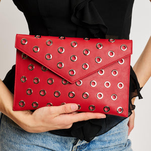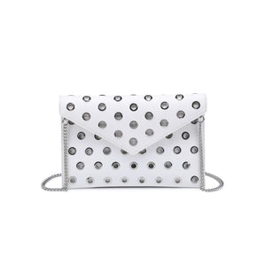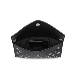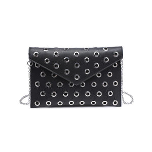 This envelope-shaped beauty, adorned with edgy grommet details, effortlessly transitions from day to night. Its detachable chain strap offers versatility, while the interior’s fabric lining and three card slots ensure you carry your essentials with impeccable style.