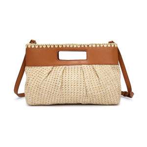 Exterior Details: woven straw body with stitched pleats and braided trim, combined with a top trim, hand cutout and adjustable strap for comfortable, secure carrying.