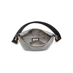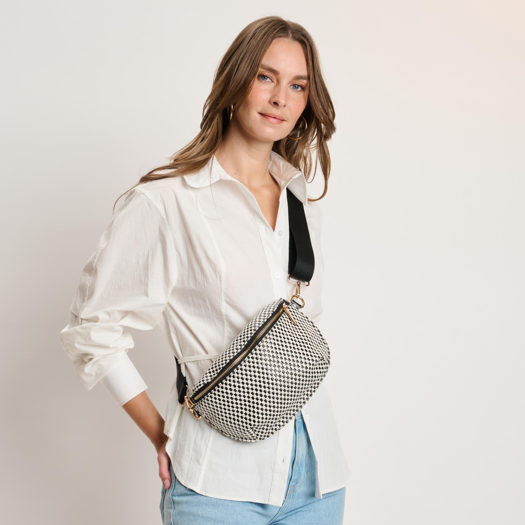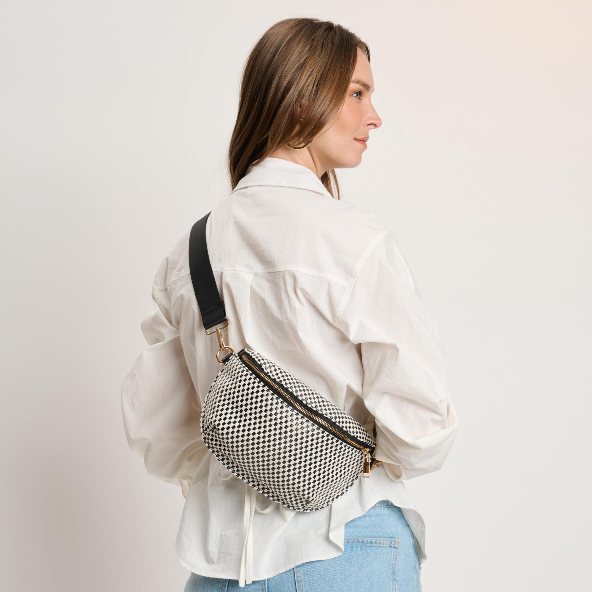 Gizelle — compact checker-print belt bag with an adjustable wide strap.