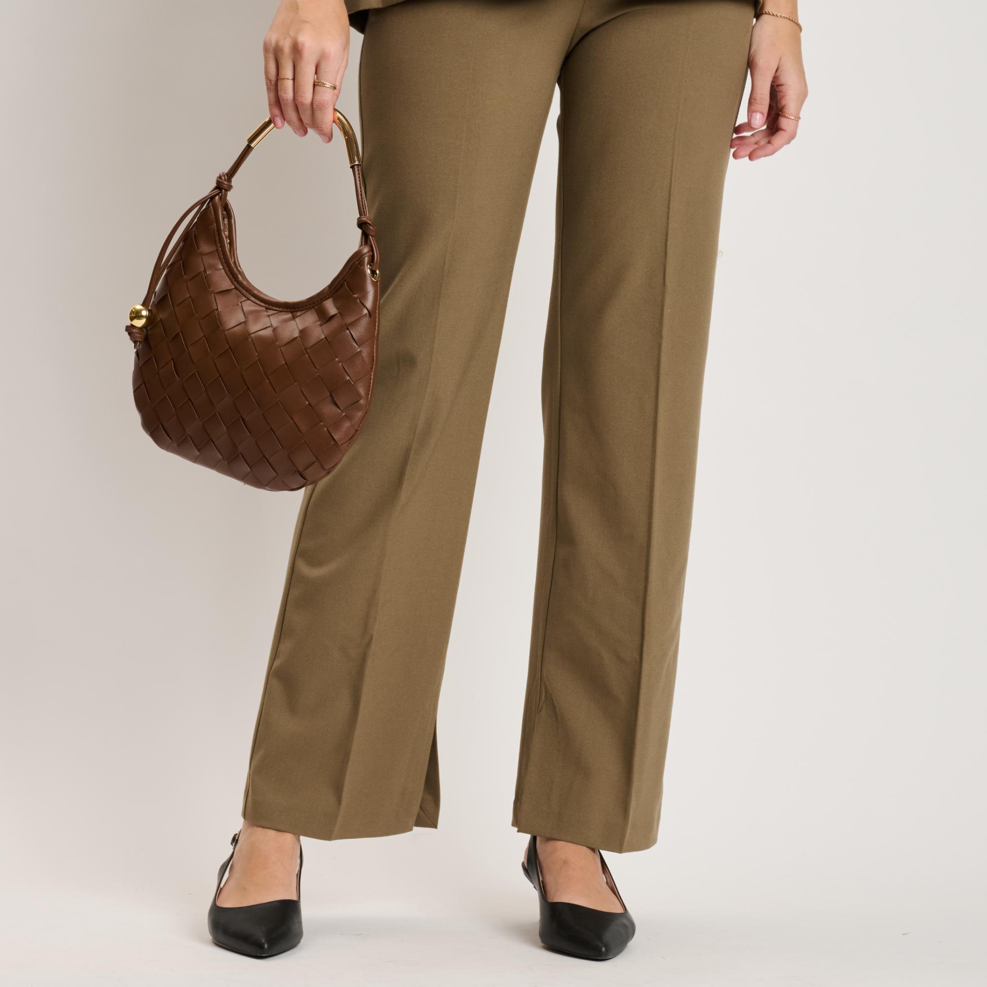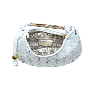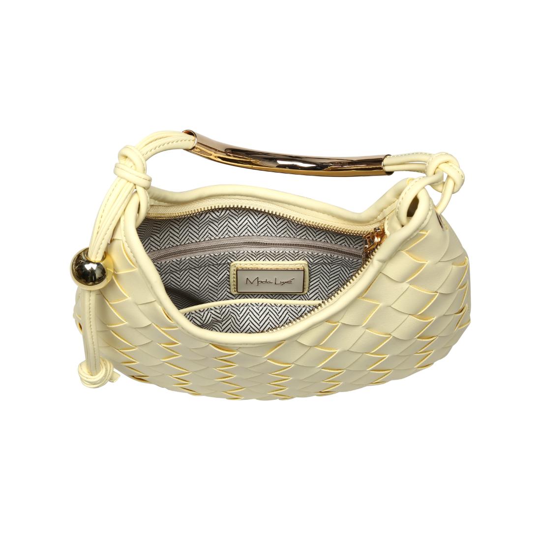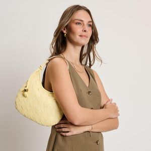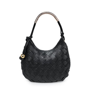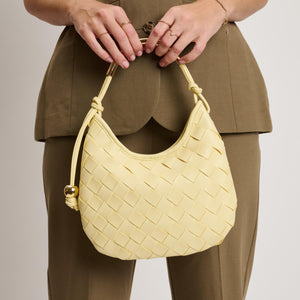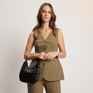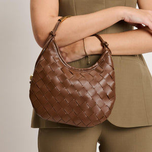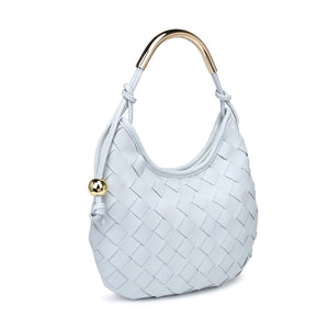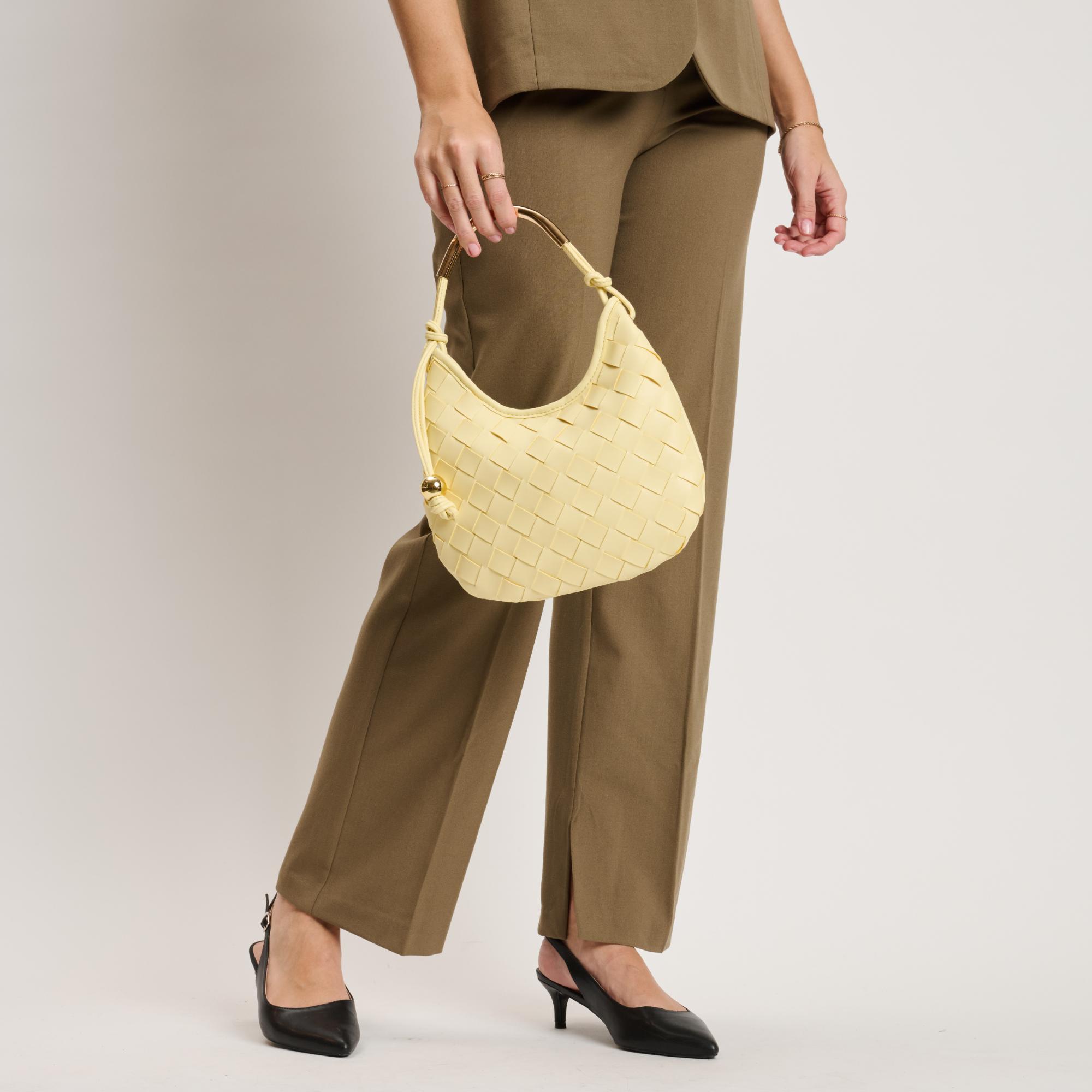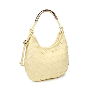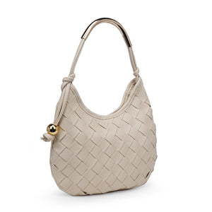 Woven front, smooth back, knotted side strap with a polished metal bead, curved metal top handle. Compact yet roomy; zip-top secures essentials. Ideal for daytime-to-evening looks, pairs with tailoring or weekend denim. A modern, fashion-forward hobo for women who favor texture, clean lines, and practical organization.