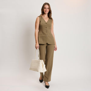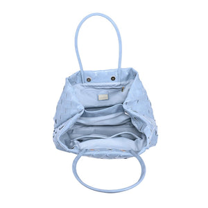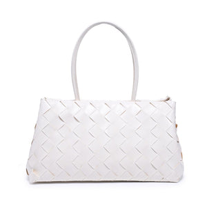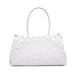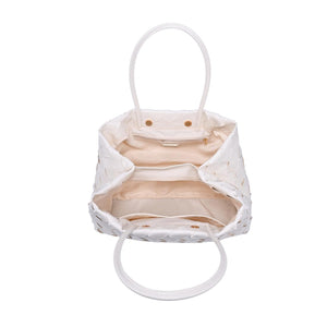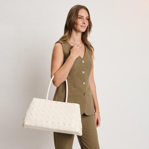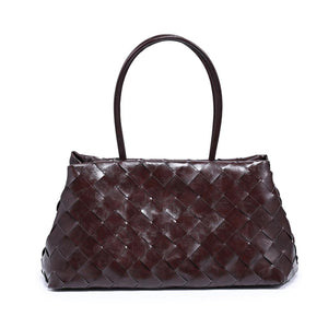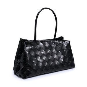 Woven-panel Elsy Satchel — a sleek, structured carryall. Glossy woven finish, slender double handles, and a stable base. Spacious interior with zip and slip pockets, fits daily essentials plus a tablet. Polished minimal hardware for an on-trend yet timeless look. Wear it to work, weekend brunch, or evening plans; versatile, refined, and modern.