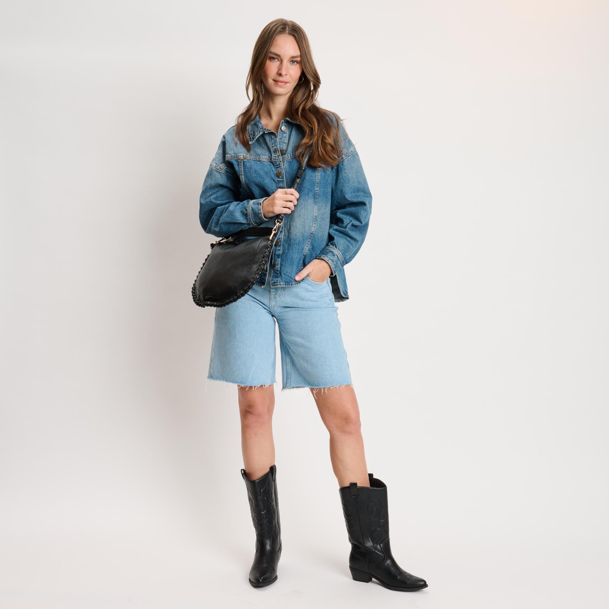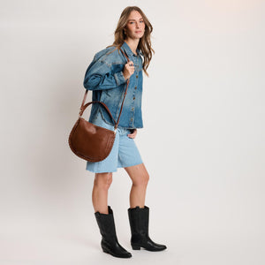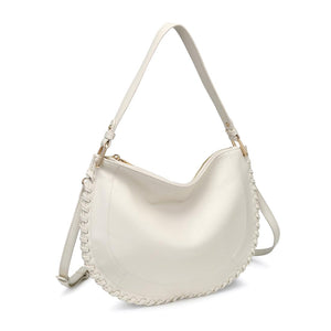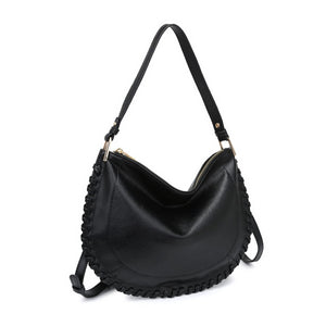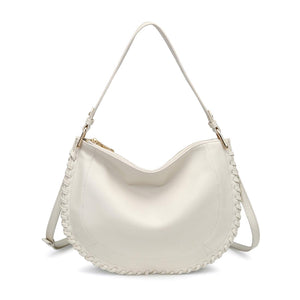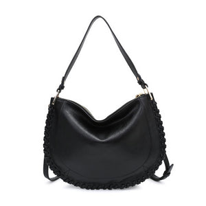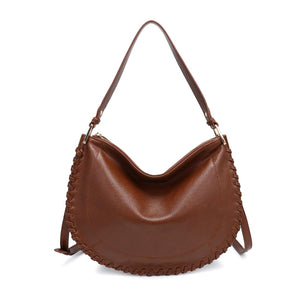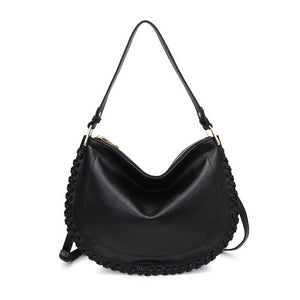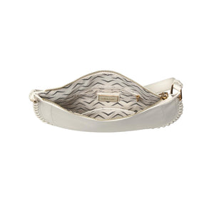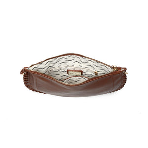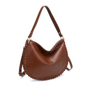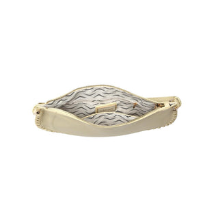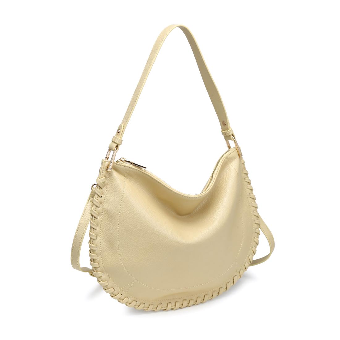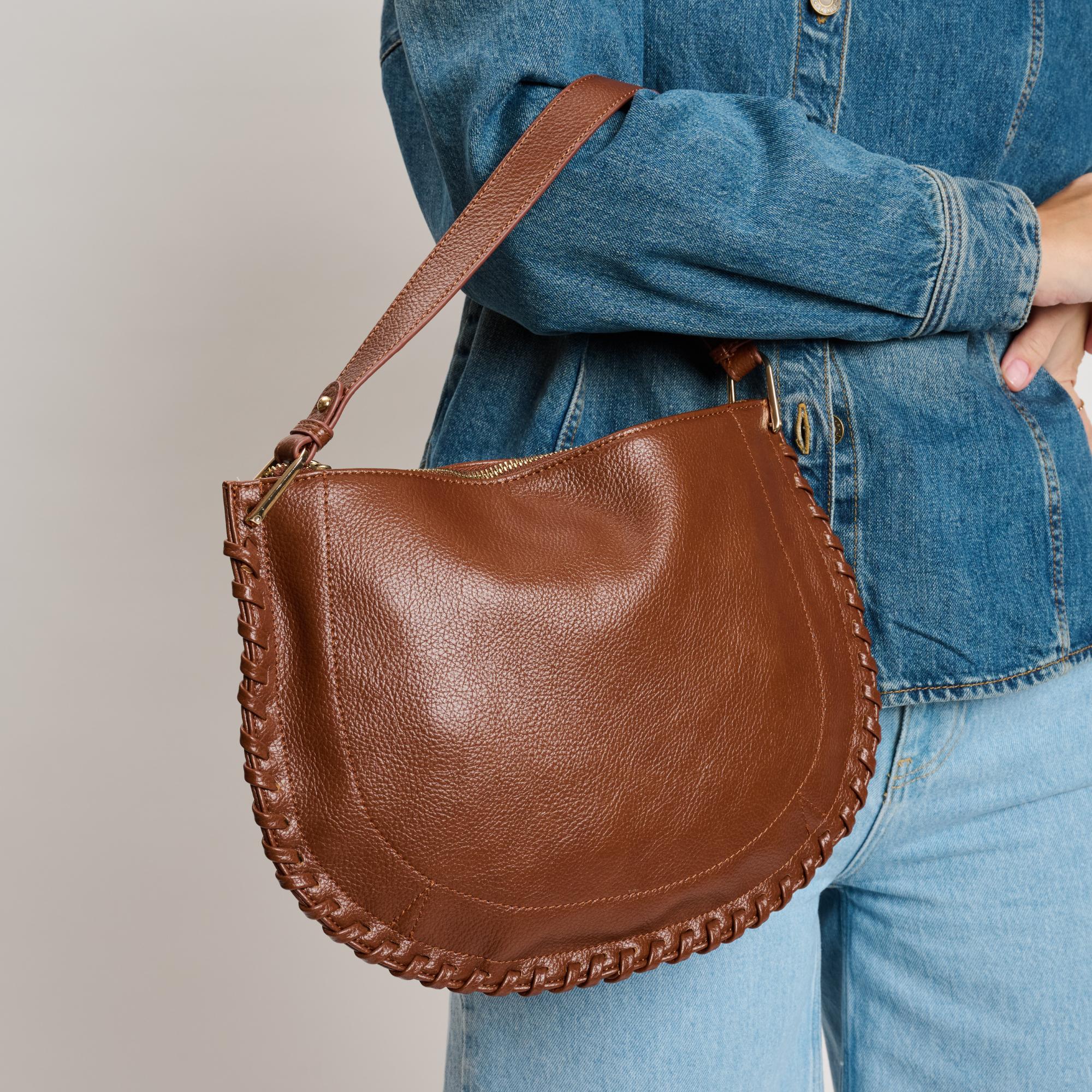 Exterior Details: Pebble-grain leather body with whipstitched braided trim and gold-tone hardware; flat shoulder strap sits comfortably under the arm for easy hands-free wear.
