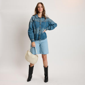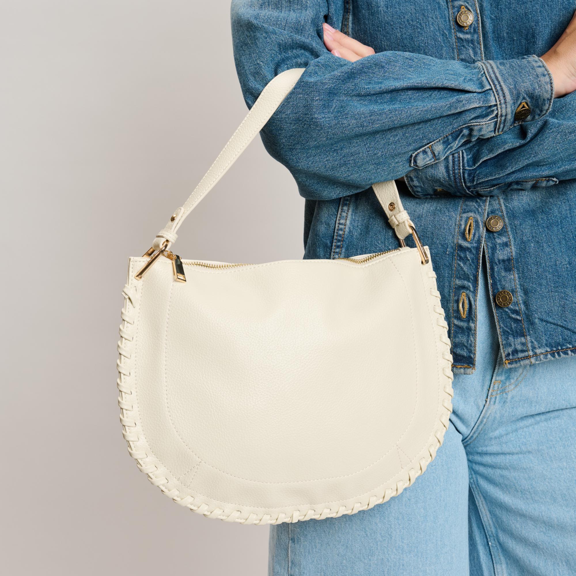 This modern hobo bag features pebbled faux leather, a relaxed drape and whipstitch trim for on-trend texture. Zip-top closure keeps essentials secure, while interior pockets organize phone, cards and keys. Wear it two ways: comfortable shoulder carry with the short strap, or hands-free with the adjustable long strap. Spacious yet refined, this everyday shoulder bag pairs effortlessly with workwear or weekend looks.