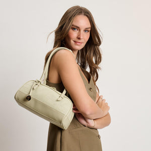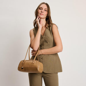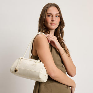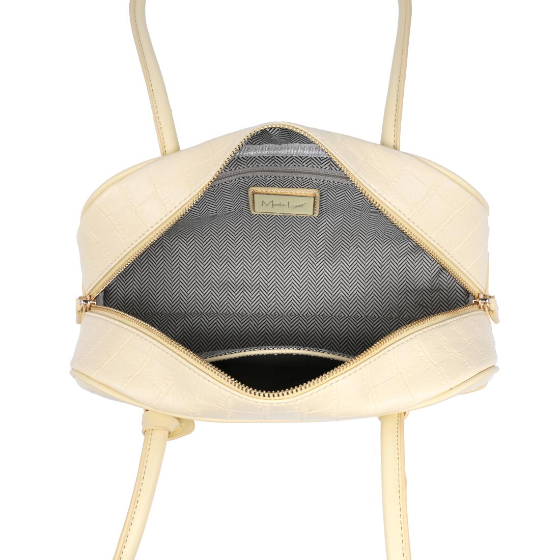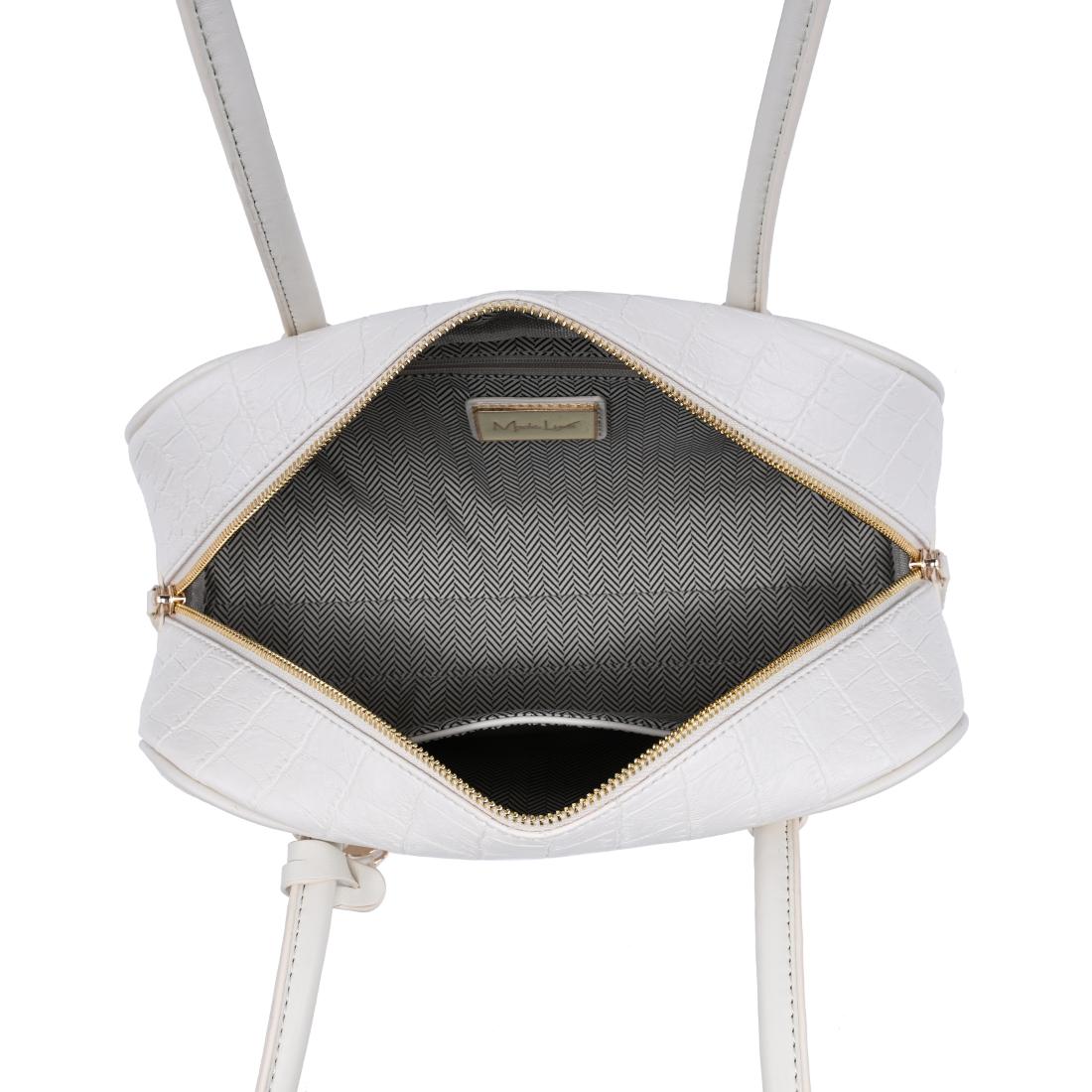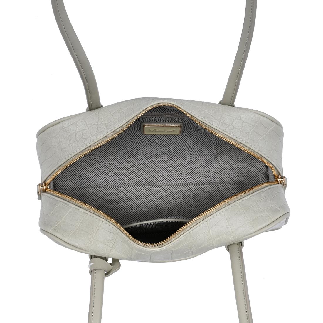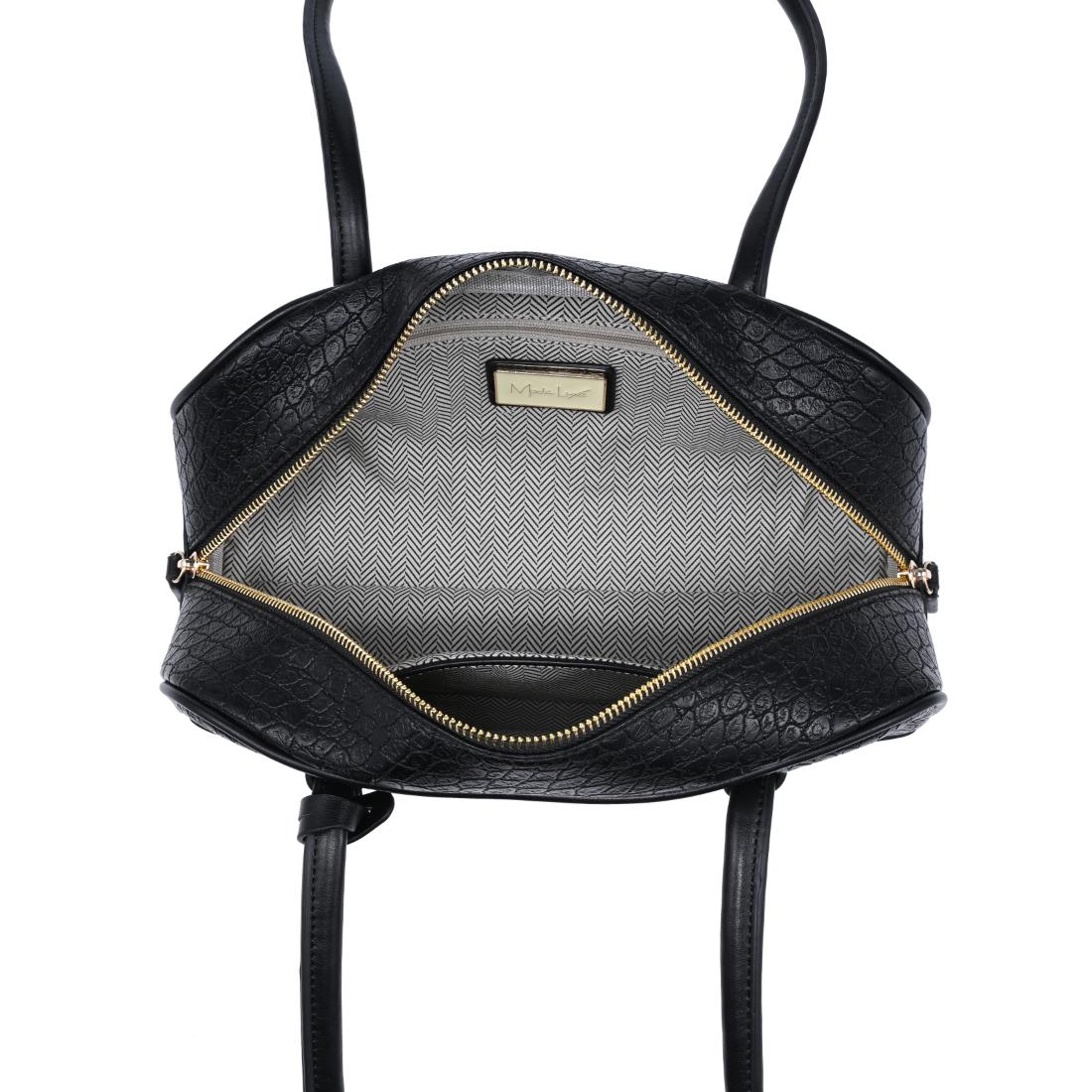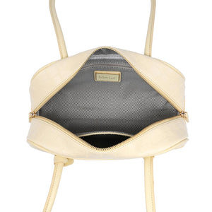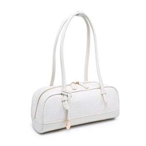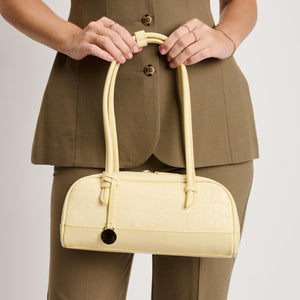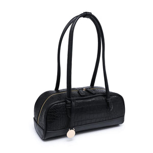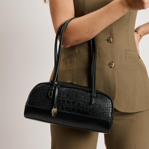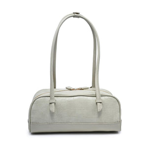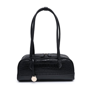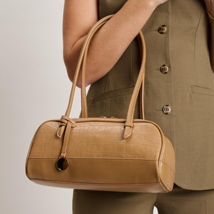 Exterior Details: Long double handles allow shoulder or crook carry and sit comfortably; croc-embossed rounded body adds structure, accented by gold-tone zipper and charm.